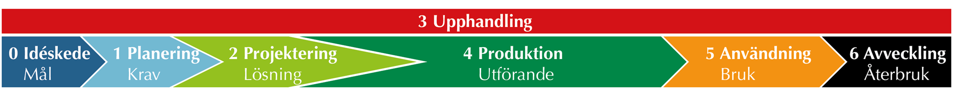 Livscykelprocessen delas in i följande skeden, baserat på SS-EN 16310:2013.